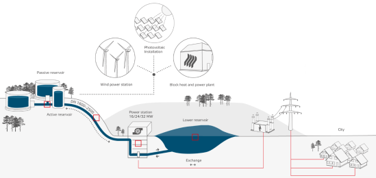 The innovative combination of renewable energy sources and a pumped-storage power plant creates a powerful storage system for flexible power supply. The Water Battery acts as a short-term storage facility and helps maintain the grid stability.