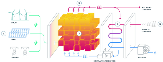 Rondo Energy’s system heats thousands of tons of brick by thermal radiation when electricity is in surplus, stores that energy for hours or days, and recovers energy when it is needed.