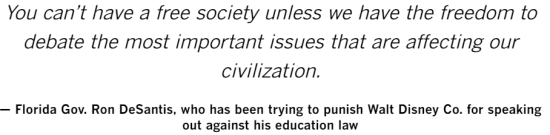 DeSantis is not exactly a libertarian himself, unless you define a libertarian as someone who bans books, forces women to give birth, threatens to take trans youth away from parents who approve of their getting gender-affirming care, prohibits teachers from mentioning gender identity or sexual orientation, bars teachers from talking about America’s history of racism, and wreaks vengeance even on Mickey Mouse for opposing his authoritarian policies.