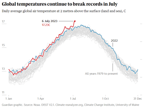 Global air temperatures for the week ended July 5 were the highest ever recorded. That led the U.N. Secretary General to say climate change is out of control. Last month António Guterres stated that countries must start phasing out oil, coal and gas – not just emissions – and demanded fossil fuel companies “cease and desist” measures that aim to “knee-cap” climate progress.