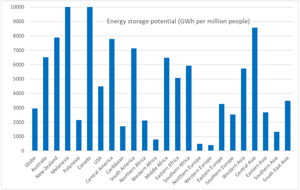 Areas with the greatest potential and the lowest-cost sites are in regions with higher elevation differences, leading to a significant concentration of potential in western North America. Places in Canada like British Columbia and Alberta. Perhaps not the latter, unless the oil industry decides their government should end its pause on clean renewable energy.