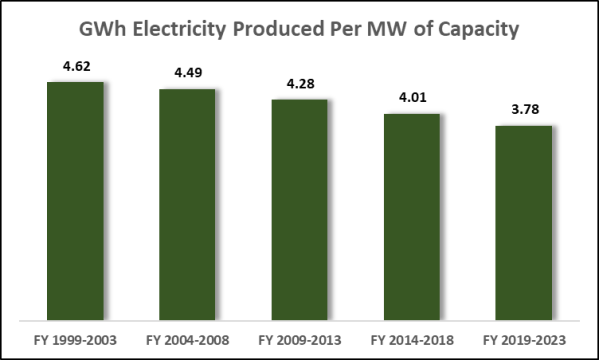 But electricity produced at hydro dams for each megawatt of capacity has steadily declined. According to BC Hydro’s Annual Reports, output in the first period charted below was 22 percent higher that in the most recent period.