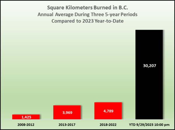 The 30,207 square kilometres (about 7.5 million acres) reported as burned in 2023 is 9x the average in the preceding 15 years and 18x times the 2008-2016 average. That latter number is significant because BC NDP operator Bill Tieleman was writing in The Tyee in 2017, blaming BC Liberals for failing to follow recommendations of Gary Filmon’s Firestorm 2003 Provincial Review and generally underspending and doing too little on wildfire prevention.