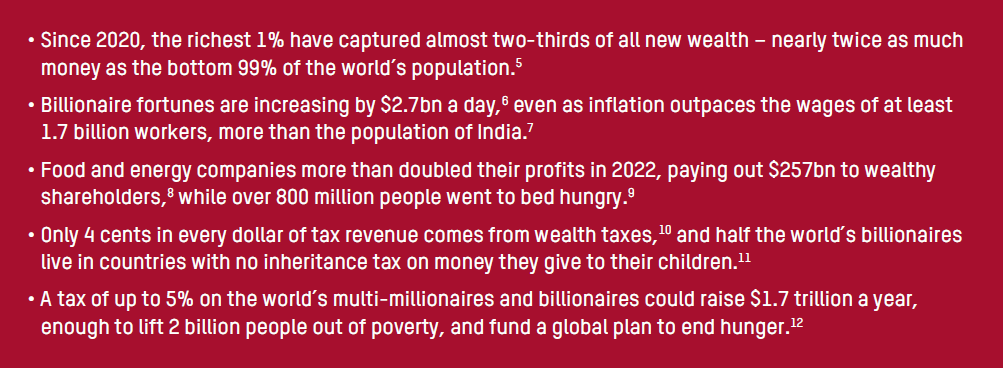 We are living through an unprecedented moment of multiple crises. Tens of millions more people are facing hunger. Hundreds of millions more face impossible rises in the cost of basic goods or heating their homes. Poverty has increased for the first time in 25 years. At the same time, these multiple crises all have winners. The very richest have become dramatically richer and corporate profits have hit record highs, driving an explosion of inequality.