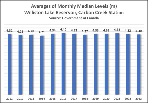 The federal government reports water levels in various watersheds. Williston Lake behind the Bennett Dam is BC Hydro’s most important reservoir. Water levels there seem not to have varied materially in recent years.