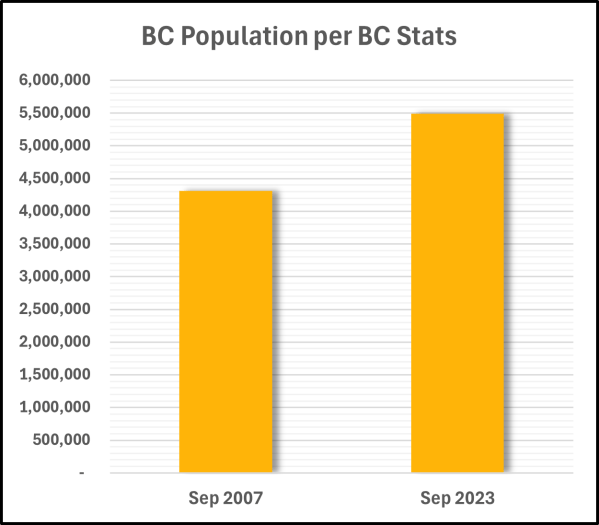 BC Hydro has often said that demand for electricity in this region is growing at a rate of 40 percent in 20 years. The company claims population increases result in greater consumption of electricity and vested interests tell us the utility must commit to major spending to serve the province.
