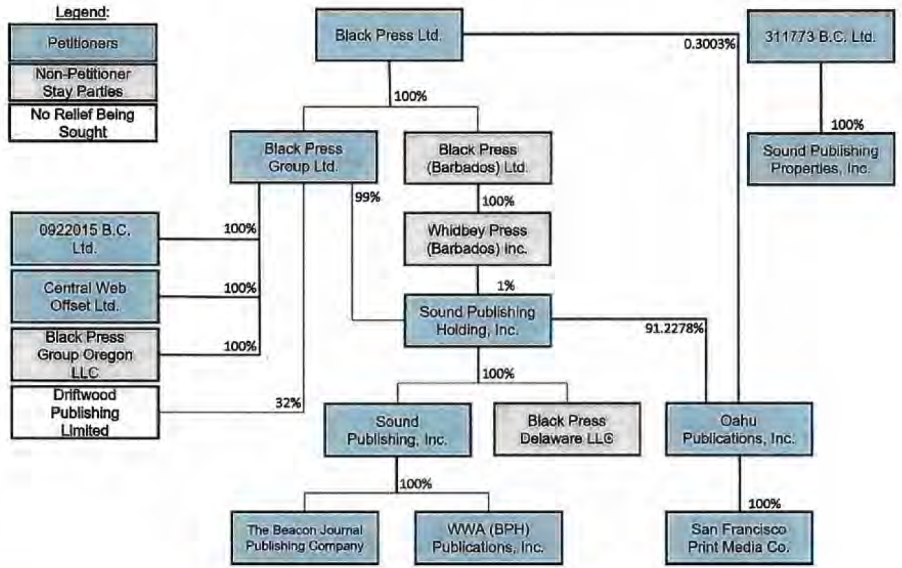 We learned this week that Black Press Ltd. and associated companies applied for protection under the Companies’ Creditors Arrangement Act. The BC based company’s main business is print and digital newspapers and magazines operating in Western and Northern Canada and in the USA. This shows companies affiliated with Black Press Ltd.