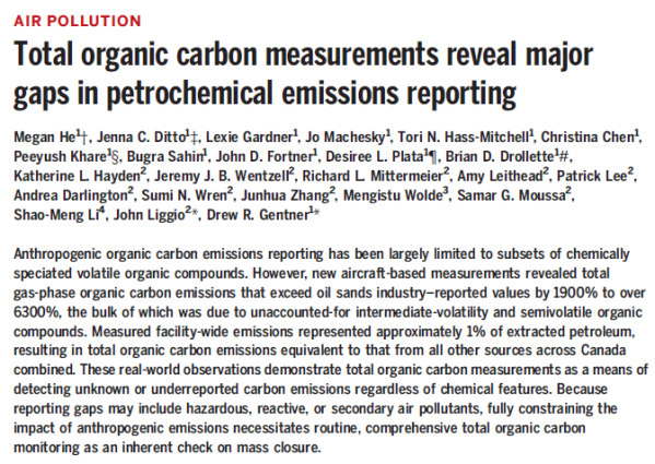 In January, twenty-four scientists from Yale University, Environment and Climate Change Canada, the National Research Council of Canada, and Peking University had a study published by the journal Science. It focused on Alberta tar sands.