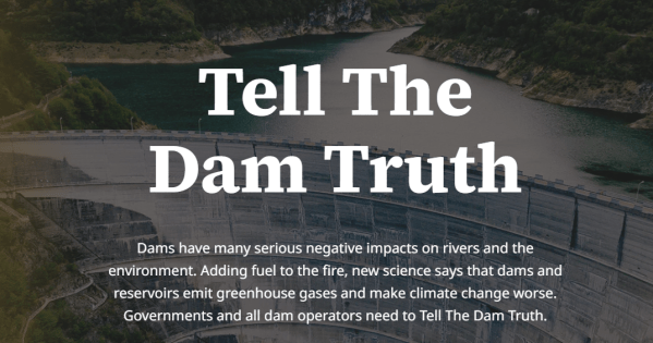 Dams have many serious negative impacts on rivers and the environment. Adding fuel to the fire, new science says that dams and reservoirs emit greenhouse gases and make climate change worse. Governments and all dam operators need to Tell The Dam Truth.