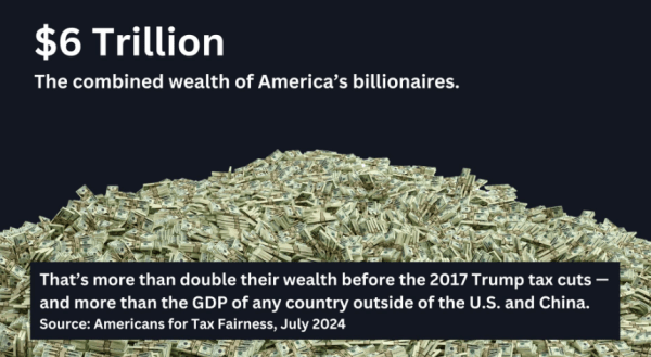 The collective fortune of America’s 806 billionaires hit a record $5.8 trillion, according to figures collected on April 1, 2024, by Americans for Tax Fairness (ATF) for its latest report on billionaire wealth growth based on Forbes data. Billionaire wealth has nearly doubled—up $2.9 trillion—since enactment in late 2017 of the Trump-GOP tax law. Under current rules, none of that nearly $3 trillion in wealth gain–the main form of income for the ultra-wealthy–may ever be taxed.