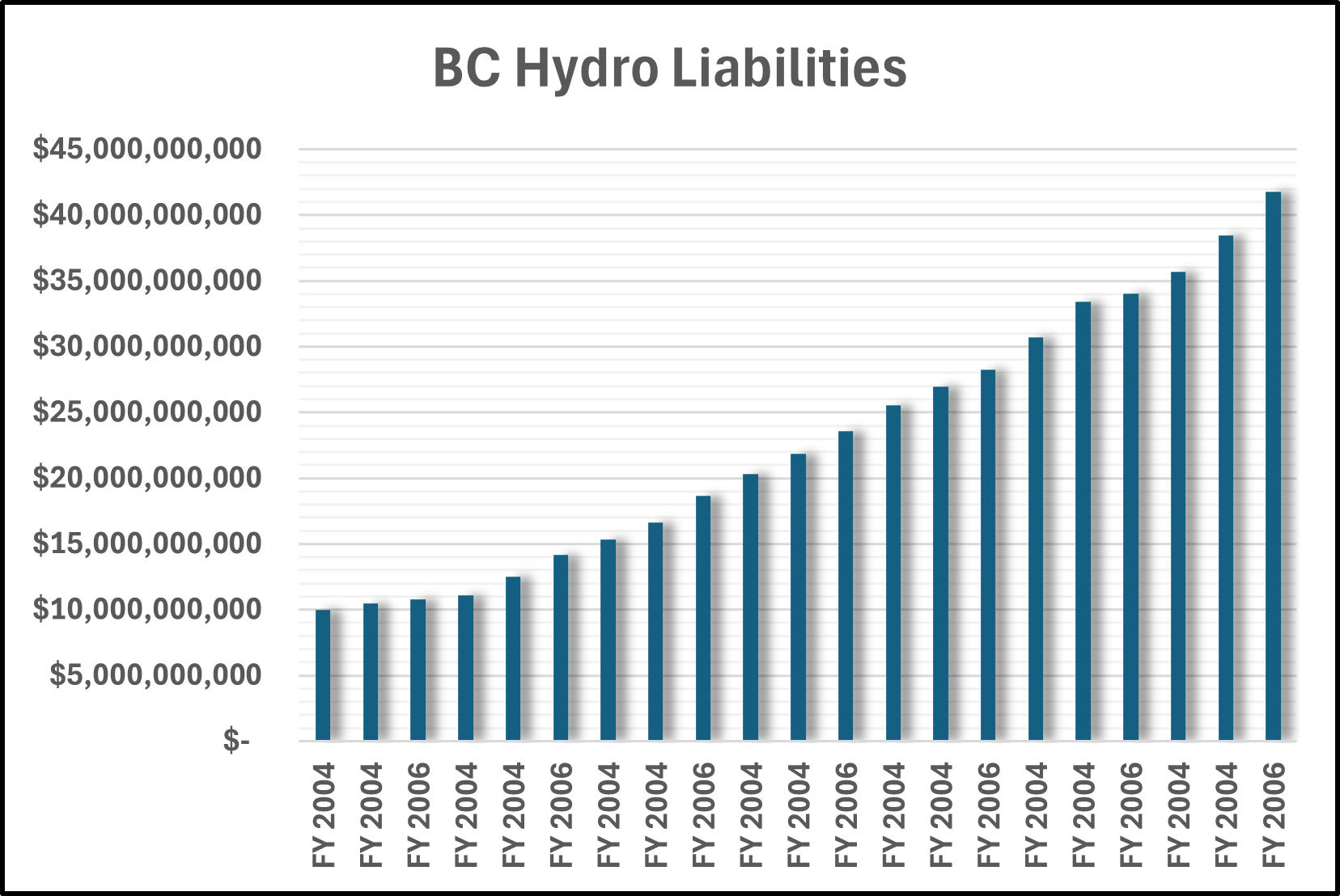 BC Hydro’s sales to BC consumers have been climbing slowly but the utility’s liabilities have been soaring. In FY 2004 those totaled $9.96 billion. In FY 2024, liabilities were $41.75 billion.