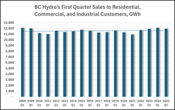 BC Hydro’s actual sales numbers do not live up to the forecasts. This chart shows sales during the first quarter of 18 fiscal years.