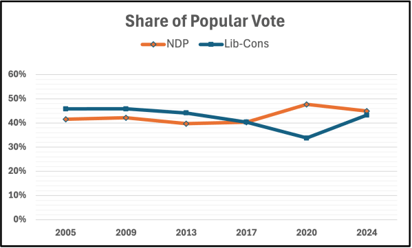 While BC voters moved to the right in October, the voting pattern was not substantially different than in earlier times.
