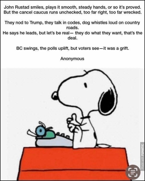 1. I believe we came within a couple of seats of having these folks installed as Cabinet Ministers in the B.C. government. Had Rustad and the BC Conservatives narrowly prevailed in the last election instead of the other way around, he could not have afforded them as disgruntled backbenchers (they have already shown why), and as he doesn’t appear to have the character or tools to control them, likely would have appeased them with status.