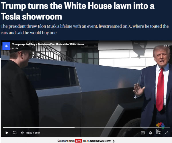 Today’s car show at 1600 Pennsylvania Avenue is additional evidence. White House deputy chief of staff Dan Scavino livestreamed the event on Elon Musk’s social media app X. The Tesla share price increased more than 7% today, so the stunt added $55 billion to the company’s market capitalization. Members of the Trump crime family who knew about the car show had an unusual profit opportunity.