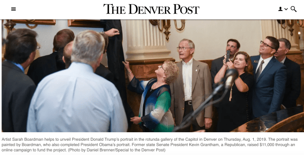 Colorado artist Boardman has a portfolio of fine works, including two former American Presidents. Her talent is obvious so it is not surprising the Republicans selected her to create an image of Trump. It is actually a quite flattering picture of a 73-year-old man